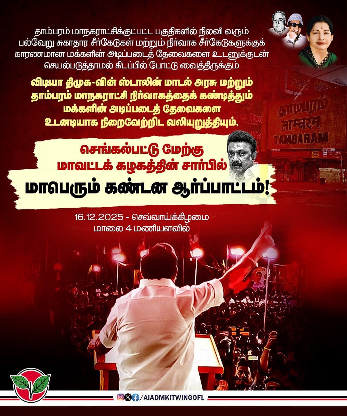 தாம்பரம் மாநகராட்சிக்குட்பட்ட பகுதிகளில் நிலவி வரும் பல்வேறு சுகாதார சீர்கேடுகள் மற்றும் நிர்வாக சீர்கேடுகளுக்குக் காரணமான; மக்களின் அடிப்படைத் தேவைகளை உடனுக்குடன் செயல்படுத்தாமல் கிடப்பில் போட்டு வைத்திருக்கும் விடியா திமுக-வின் ஸ்டாலின் மாடல் அரசு மற்றும் தாம்பரம் மாநகராட்சி நிர்வாகத்தைக் கண்டித்தும்; மக்களின் அடிப்படைத் தேவைகளை உடனடியாக நிறைவேற்றிட வலியுறுத்தியும், செங்கல்பட்டு மேற்கு மாவட்டக் கழகத்தின் சார்பில் மாபெரும் கண்டன ஆர்ப்பாட்டம்!