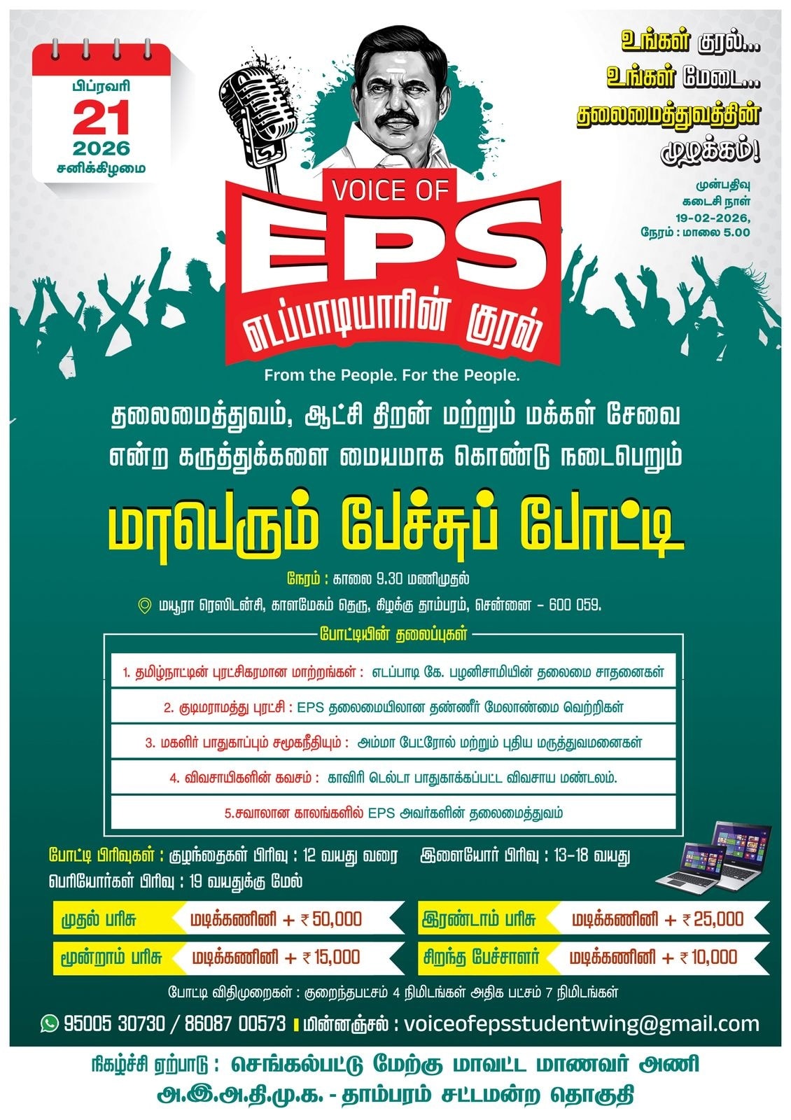 தலைமைத்துவம், ஆட்சித்திறன் மற்றும் மக்கள் சேவை என்ற கருத்துக்களை மையமாகக் கொண்டு நடைபெறும் *மாபெரும் பேச்சுப்போட்டி*