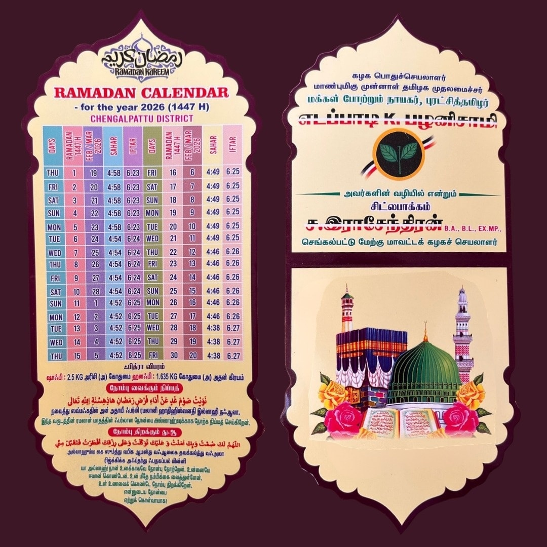 இன்று (20-02-2026) வெள்ளிக்கிழமை ஜூம்ஆ தொழுகையை முன்னிட்டு மேற்கு தாம்பரம் சண்முகம் சாலையில் அமைந்துள்ள ஜூம்ஆ பள்ளிவாசலில் ரமலான் நோன்பு கால அட்டவணையை கழக நிர்வாகிகளுடன் இணைந்து வழங்கிய தருணம்... சிட்லபாக்கம்.ச.இராசேந்திரன் B.A.,B.L.,Ex.MP #செங்கல்பட்டு_மேற்கு_மாவட்டம்